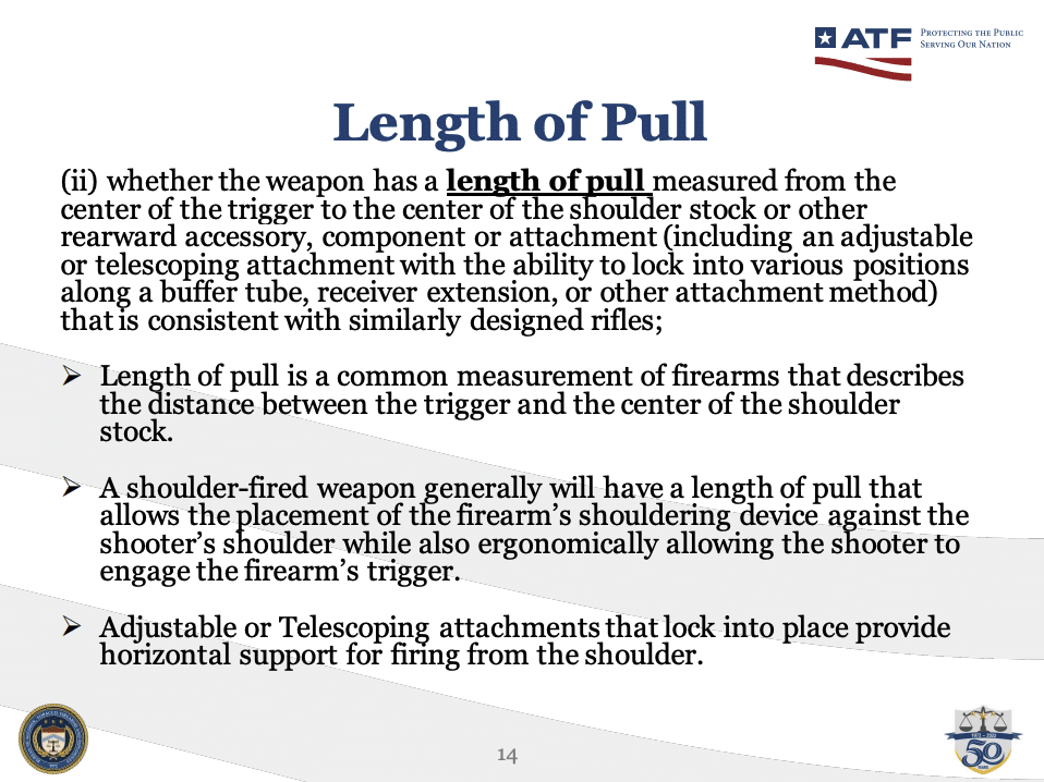 A major catalyst for this push towards regulation was the March 2021 shooting in Boulder, CO. During the shooting, the perpetrator used a Ruger AR-556 pistol, a braced AR-style pistol. This prompted President Biden to direct the Department of Justice in April 2021 to establish formal standards for what constituted a pistol vs an SBR, tighten regulations, and close what they deemed “a loophole” to owning short-barreled rifles. By June 2021, the ATF had published a “Notice of Proposed Rulemaking” that detailed objective criteria for classifying firearms with stabilizing braces. The proposed criteria would look at multiple elements.