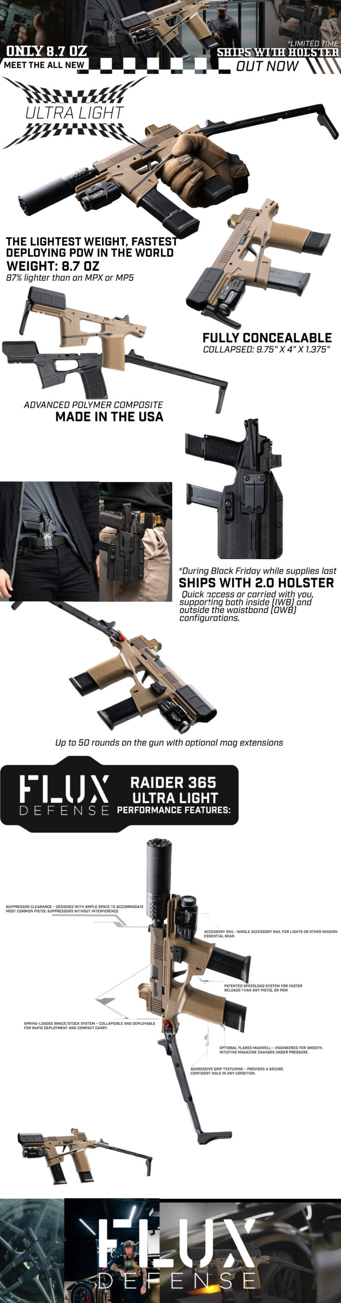 Introducing the Raider 365 Ultralight. Designed to be carried IWB/OWB or off body without becoming a heavy or encumbering. You get double the rounds of a pistol, increased accuracy, control and velocity… all in a package that is 3” shorter and 85 percent lighter than an MP5K. The Ultralight comes with a new adjustable holster that can be mounted off body or taken with you to carry inside or outside the waistband. INSTALL VIDEO HERE